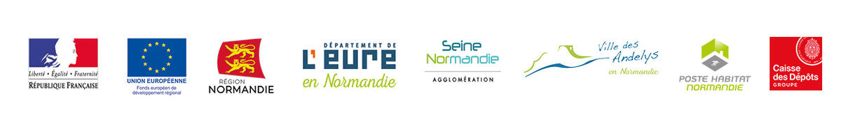 Financements : État, FEDER (Union Européenne) à hauteur de 341 258,40 €, Région Normandie, Département de l’Eure, Seine Normandie Agglomération, Ville des Andelys, Poste Habitat Normandie, Banque des territoires — Caisse des Dépôts
